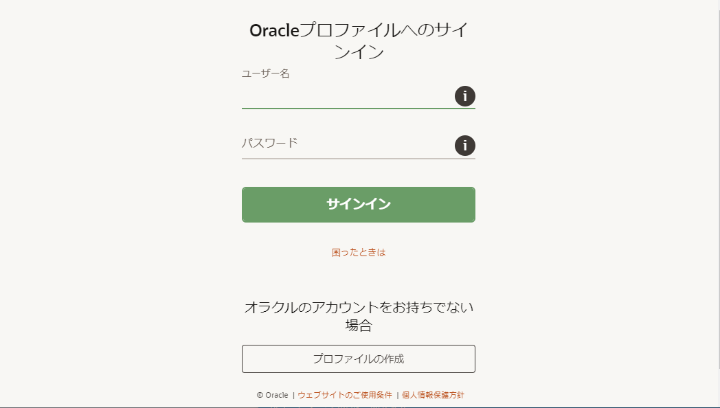 Oracleログイン画面が表示されるので、Oralceプロファイルを入力します。Oralceアカウントをお持ちでない場合、下の プロファイルの作成 をクリックして、Oralceアカウントを作成します。