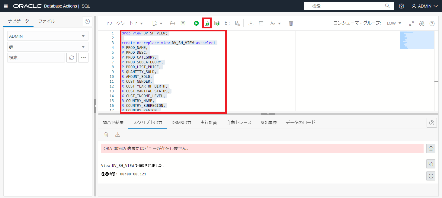 SQLワークシートが起動します。ワークシートに次のSQLを貼り付け、 スクリプトの実行 ボタンをクリックします。下のスクリプト表示に view DV_SH_VIEWは作成されました と表示されたらOKです。