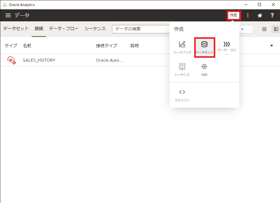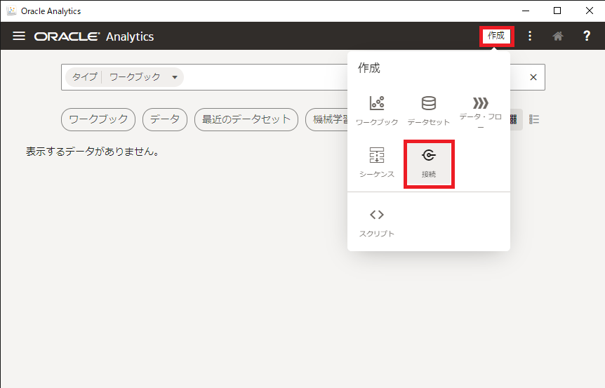 Oracle Analytics Desktop アプリケーションの右上の 作成 ボタンをクリックし、 接続 をクリックします。