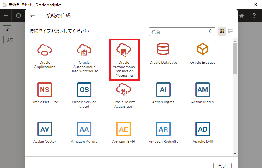 データセットの作成画面が表示されたら、 Oracle Autonomous Transaction Processing (または、Oracle Autonomous Data Warehouse を作成している場合は、Oracle Autonomous Data Warehouse )をクリックします。