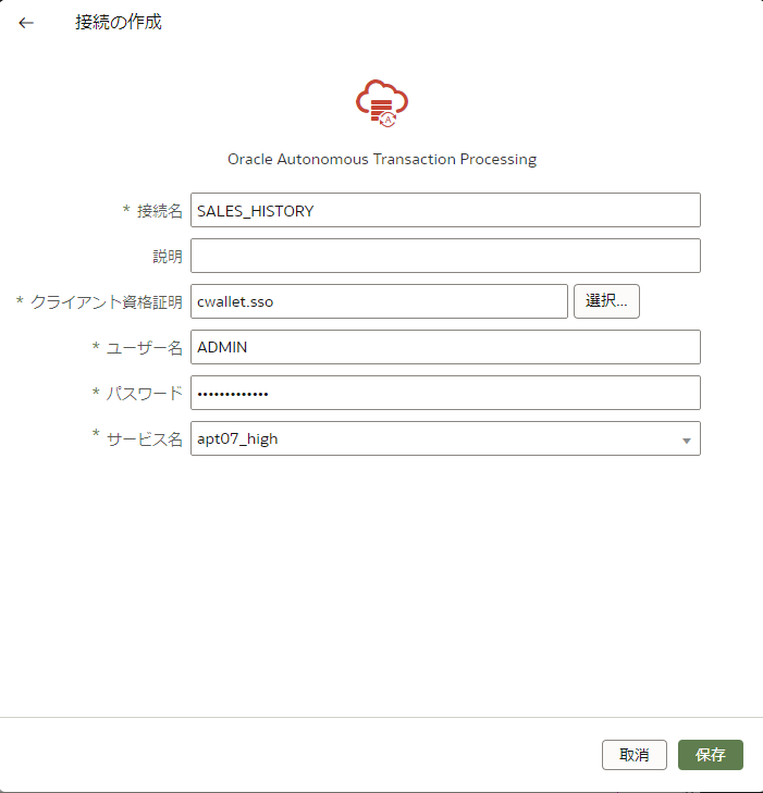 接続名 SALES_HISTORY 説明 (空白) クライアント資格証明 (事前にダウンロードしておいたウォレットzipファイルを選択) ユーザー名 ADMIN パスワード Welcome12345#