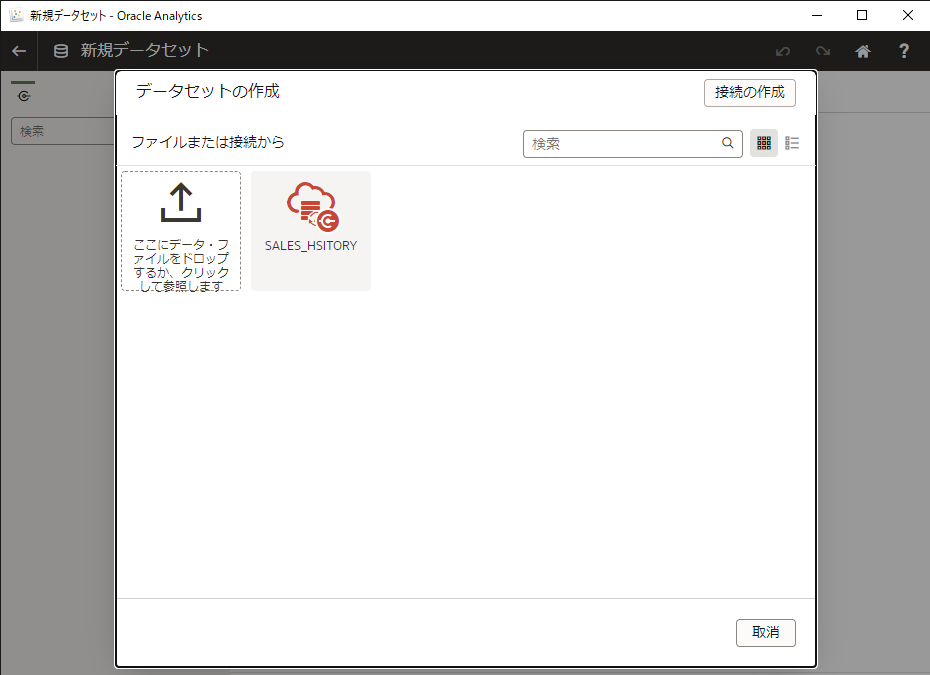 これで、見える化するデータの準備ができました。1行目の drop文は再実行用で、ビューがなければ、エラーとなります。drop文のエラーは問題ありません。drop view DV_SH_VIEW; create or replace view DV_SH_VIEW as select P.PROD_NAME, P.PROD_DESC, P.PROD_CATEGORY, P.PROD_SUBCATEGORY, P.PROD_LIST_PRICE, S.QUANTITY_SOLD, S.AMOUNT_SOLD, X.CUST_GENDER, X.CUST_YEAR_OF_BIRTH, X.CUST_MARITAL_STATUS, X.CUST_INCOME_LEVEL, R.COUNTRY_NAME, R.COUNTRY_SUBREGION, R.COUNTRY_REGION, T.TIME_ID, T.DAY_NAME, T.CALENDAR_MONTH_NAME, T.CALENDAR_YEAR from SH.PRODUCTS P, SH.SALES S, SH.CUSTOMERS X, SH.COUNTRIES R, SH.TIMES T where S.PROD_ID=P.PROD_ID and S.CUST_ID=X.CUST_ID and S.TIME_ID=T.TIME_ID and X.COUNTRY_ID=R.COUNTRY_ID;