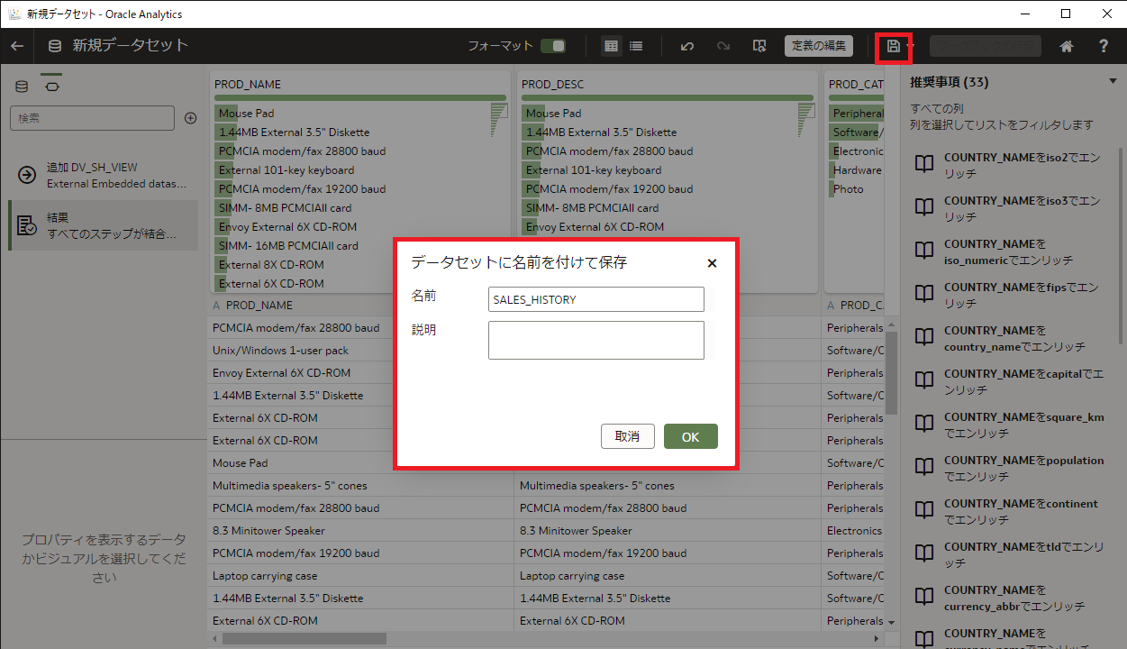 右のデータセットに追加されたので、右上の保存マークをクリックし、SALES_HISTORY と名前をつけて、OK をクリックします。