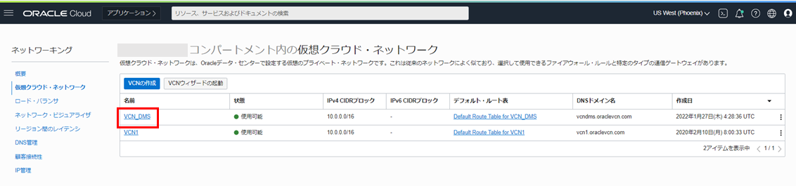 OCIコンソール・メニューから ネットワーキング → 仮想クラウド・ネットワーク に移動し、前提条件で作成したVCNを選択します。