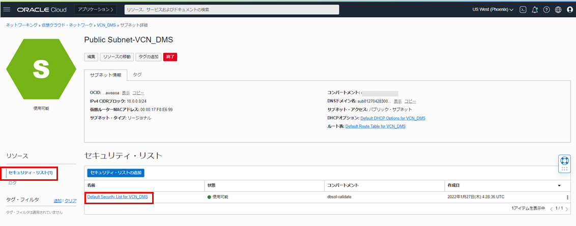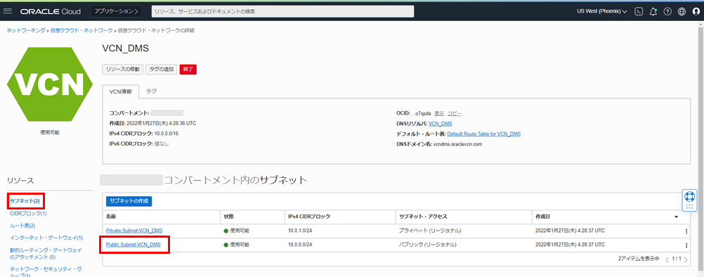 サブネット の一覧から Public Subnet-VCN名 を選択します。