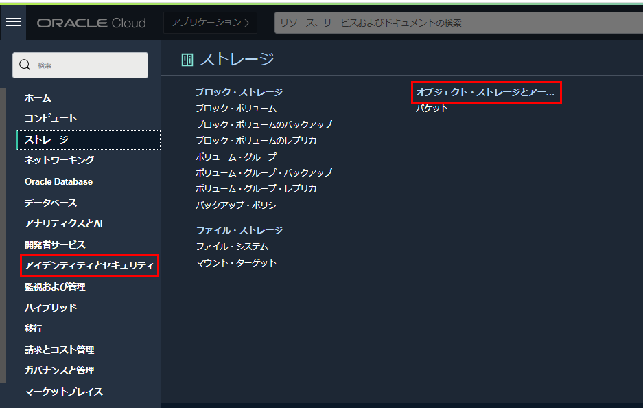 OCIコンソール・メニューから ストレージ → オブジェクト・ストレージとアーカイブ・ストレージに移動します。