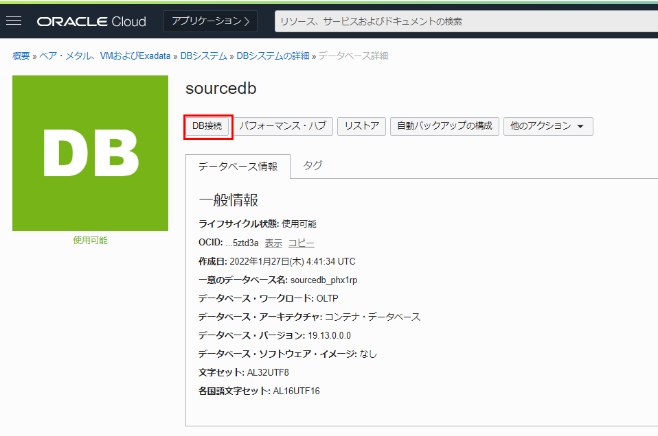 OCIコンソール・メニューから 移行とディザスタ・リカバリ → データベース接続 を選択します。