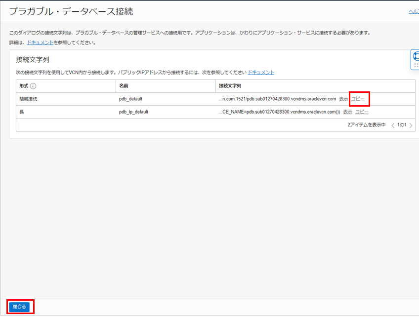 - 接続文字列 - 本チュートリアルの2-1.ソース・データベースのCDBとPDBの接続情報の確認の10.でメモ帳にコピーした接続文字列のホスト名部分をデータベース・ノードのプライベートIPアドレスと入れ替えて入力します。例:10.0.0.28:1521/pdb.sub01270428300.vcndms.oraclevcn.com