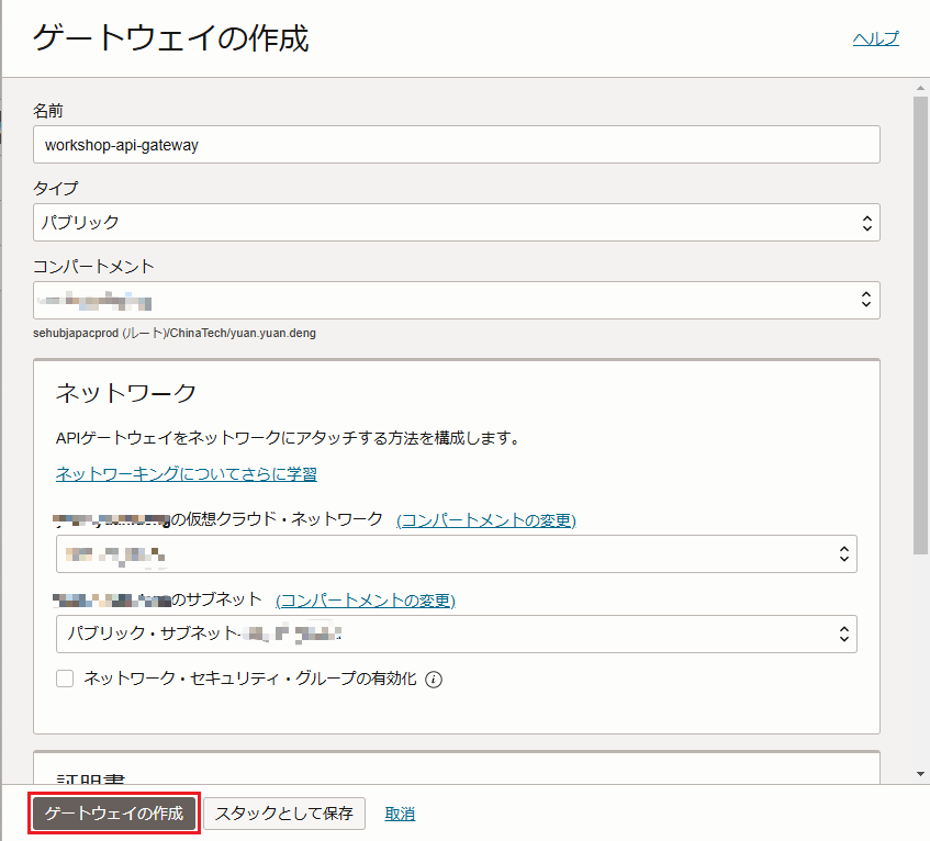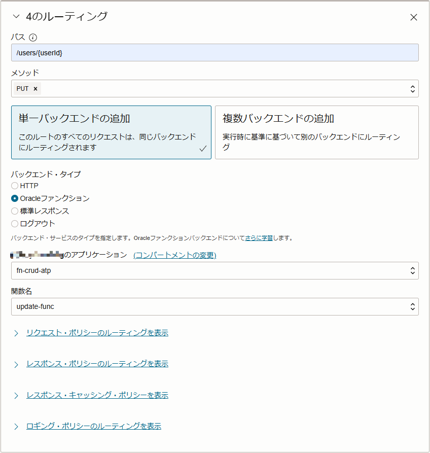 コンパートメント:OCI API Gatewayリソースを作成するコンパートメントの名前(こちらのワークショップではFunctionと同じコンパートメントを指定してください)