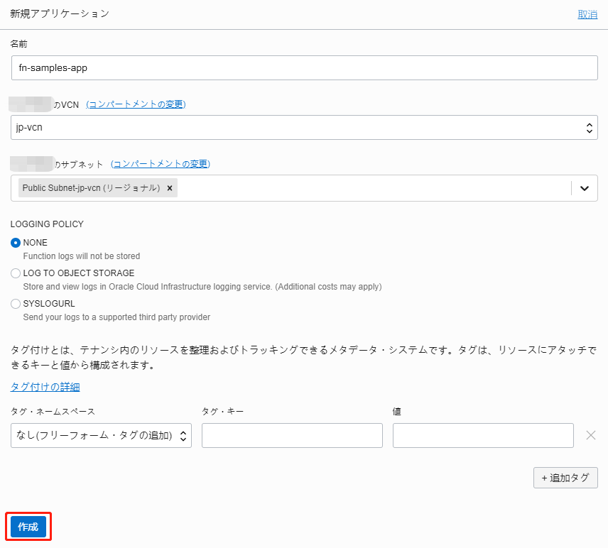 - サブネット:Functionを実行するサブネット。今回は、Oracle Functionsハンズオンで作成したVCNのパブリック・サブネットを指定。