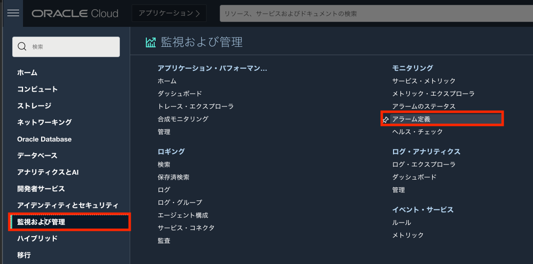 OCIコンソールハンバーガーメニューを開きます。[監視および管理]で、[アラーム定義] をクリックします。