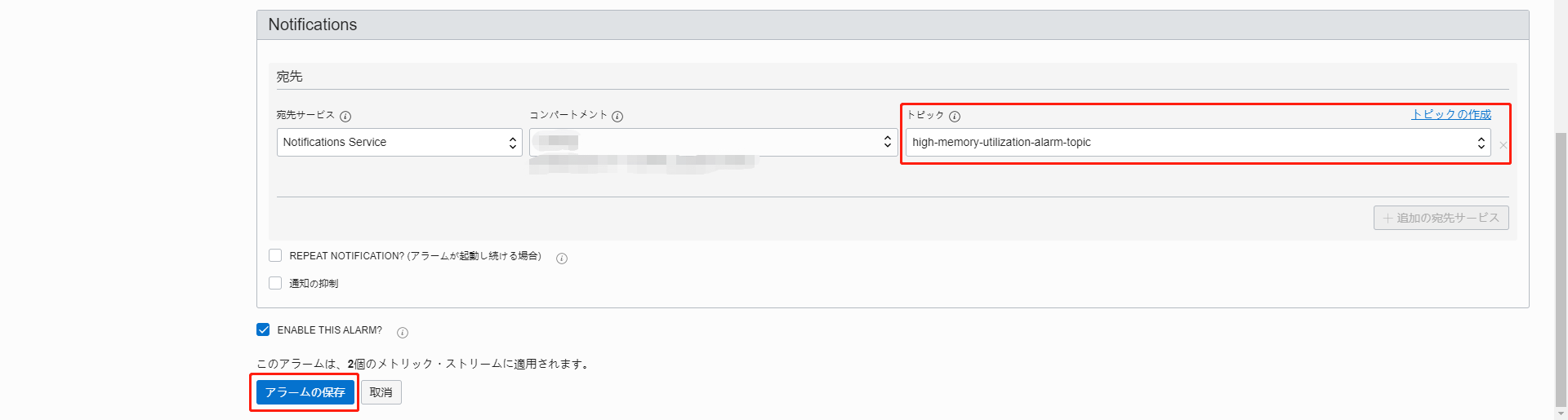 トピックから作成されたトピックを選択して、「アラームの保存」をクリックします。