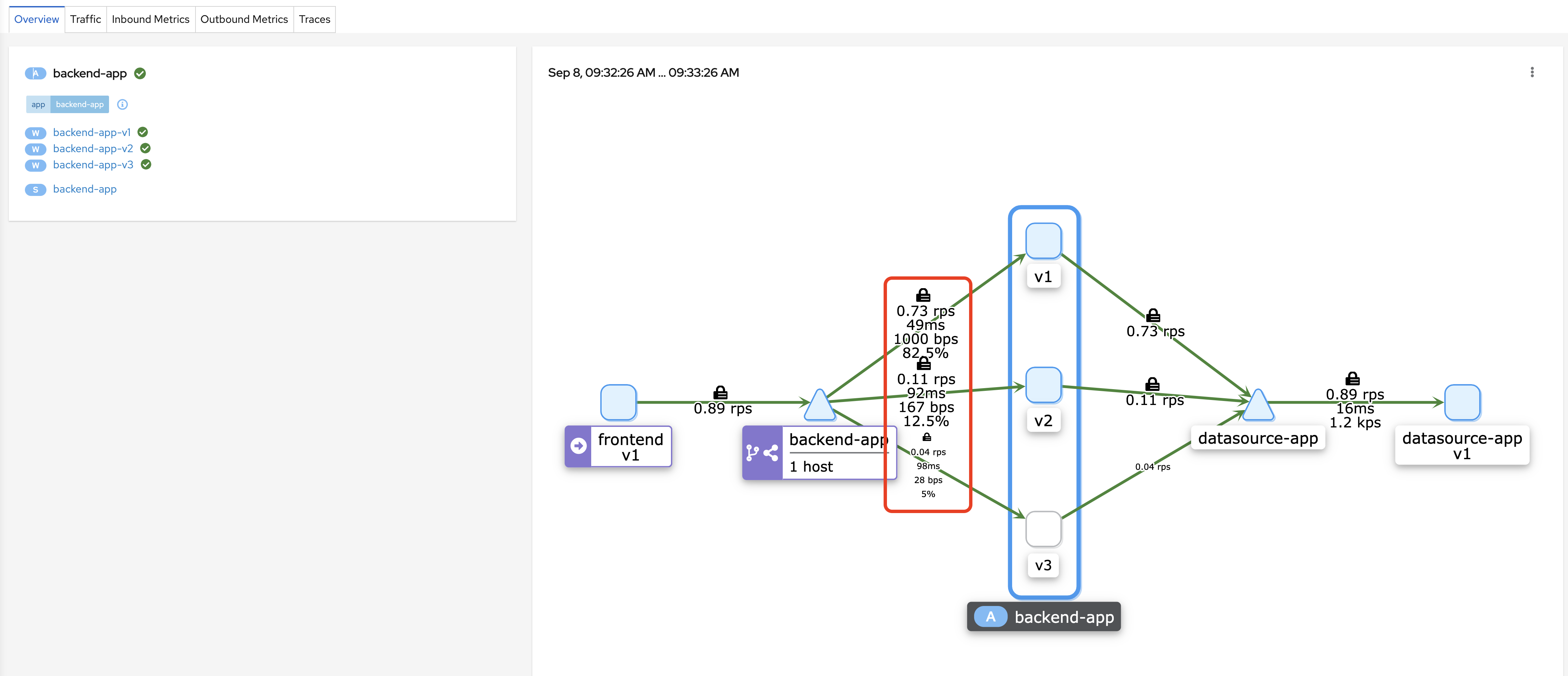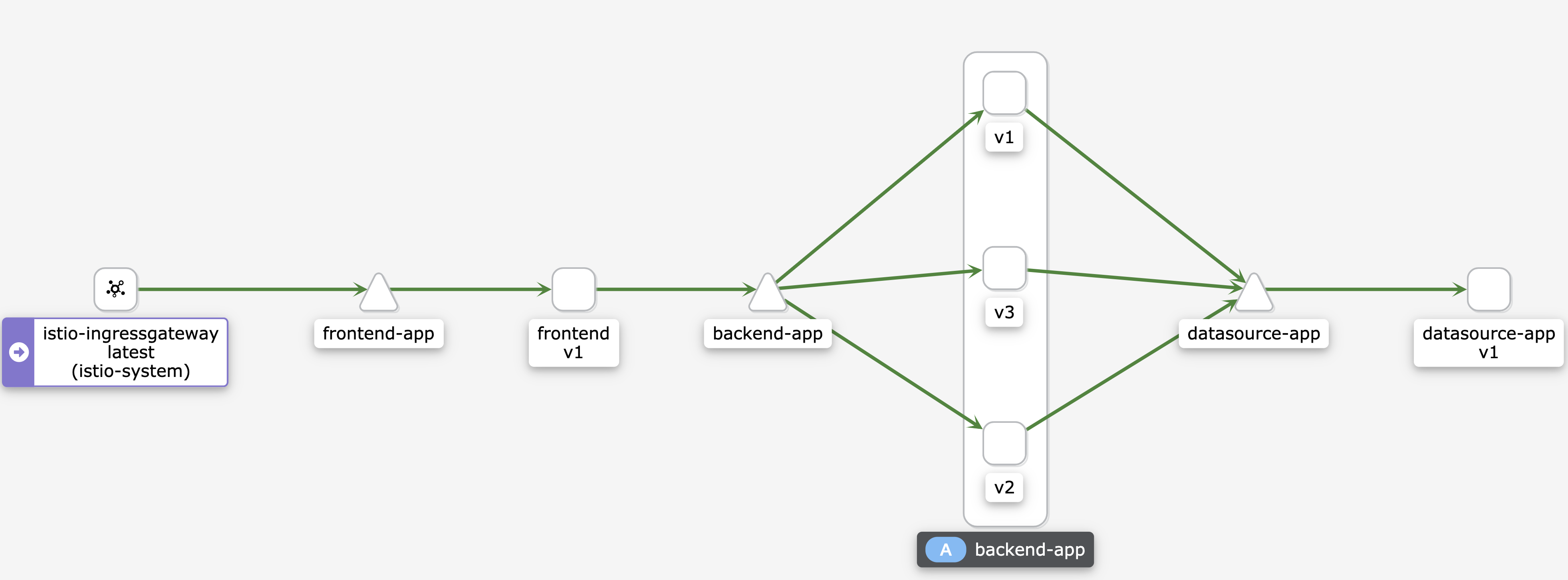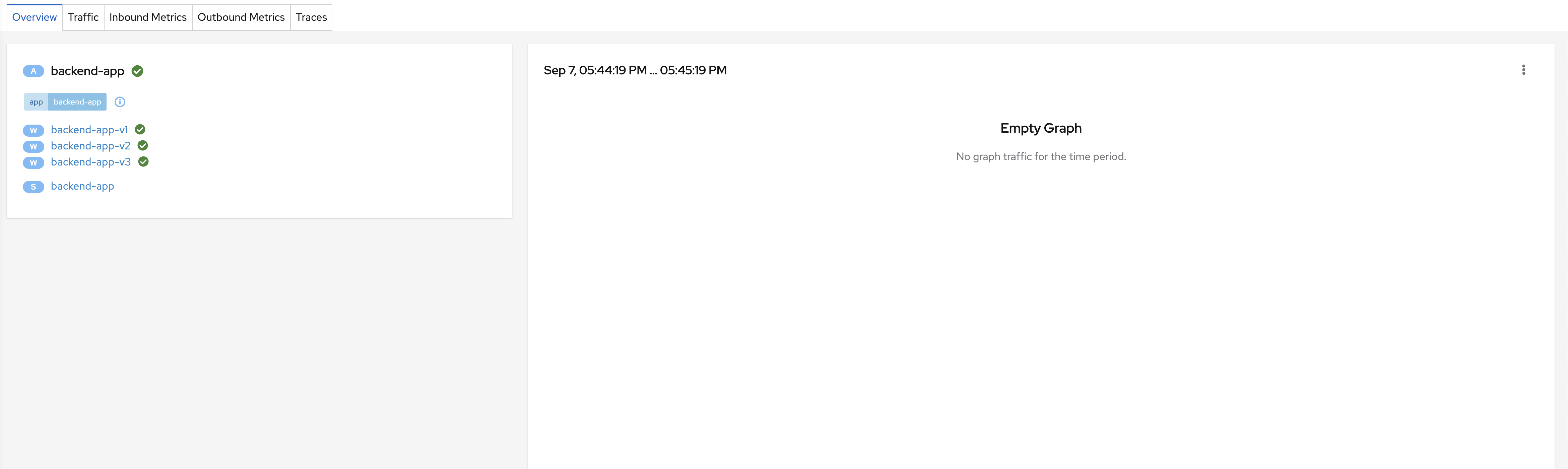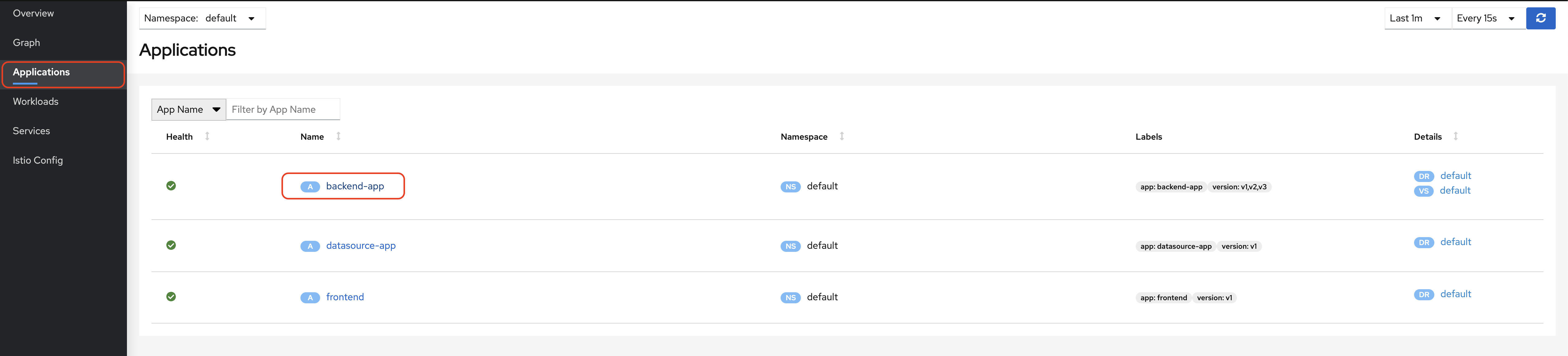 KialiのUIにアクセスし、Applicationメニューからbackend-appをクリックします。