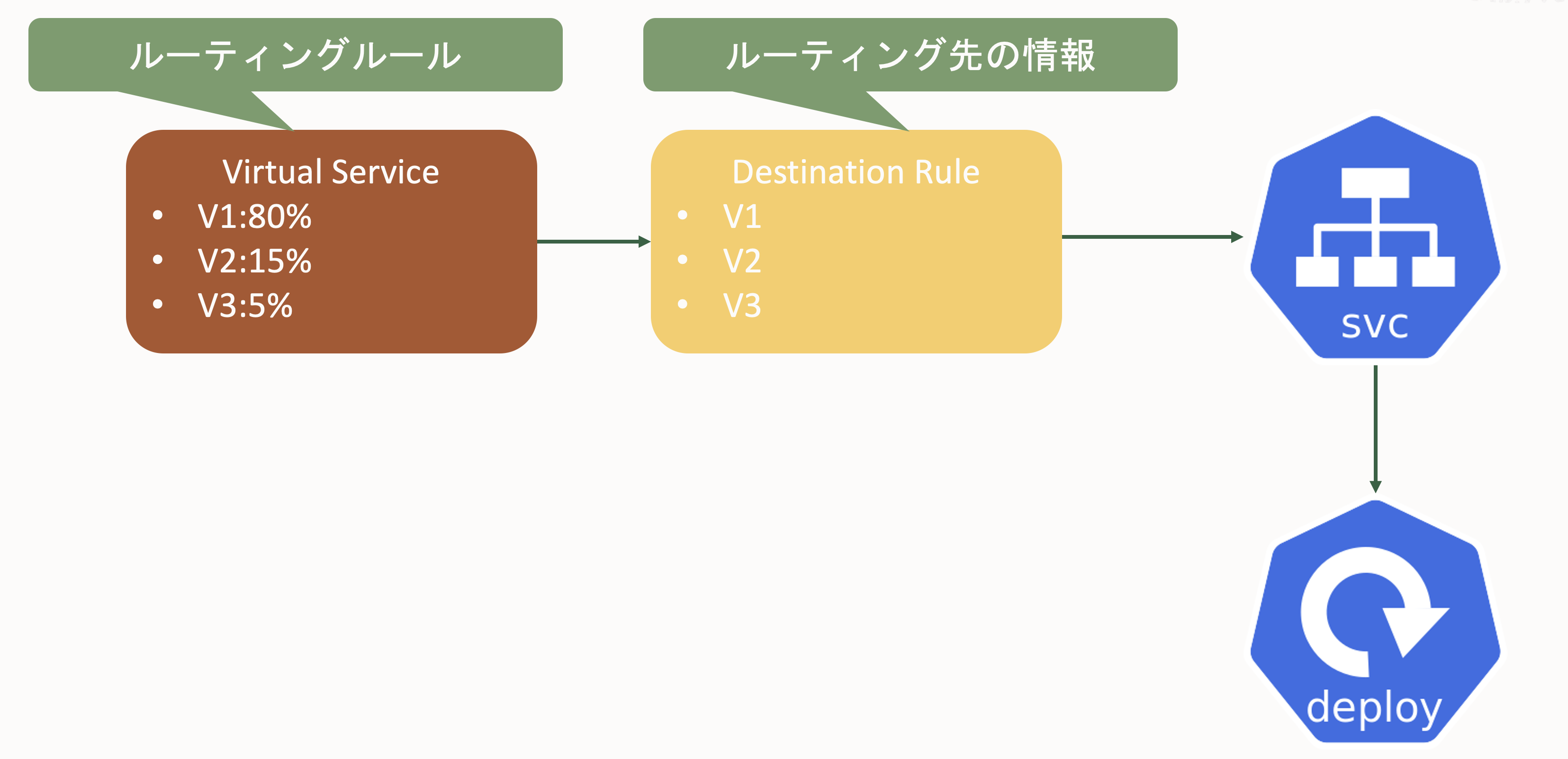 このように、Istioを利用すると適切なリソースを作成するだけで、カナリアリリースのような高度なデプロイ戦略を実施することができます。
