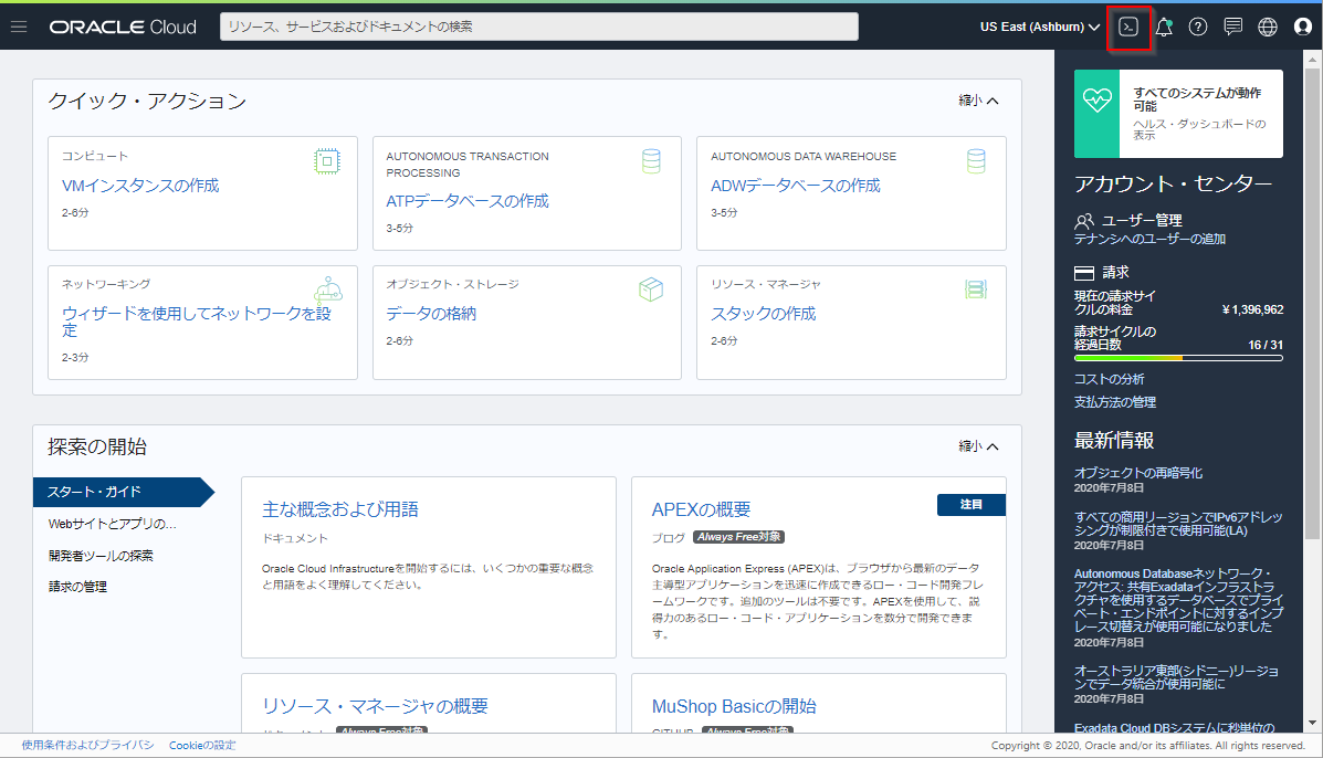 OCIコンソール上で右上にあるターミナルのアイコンをクリックします。