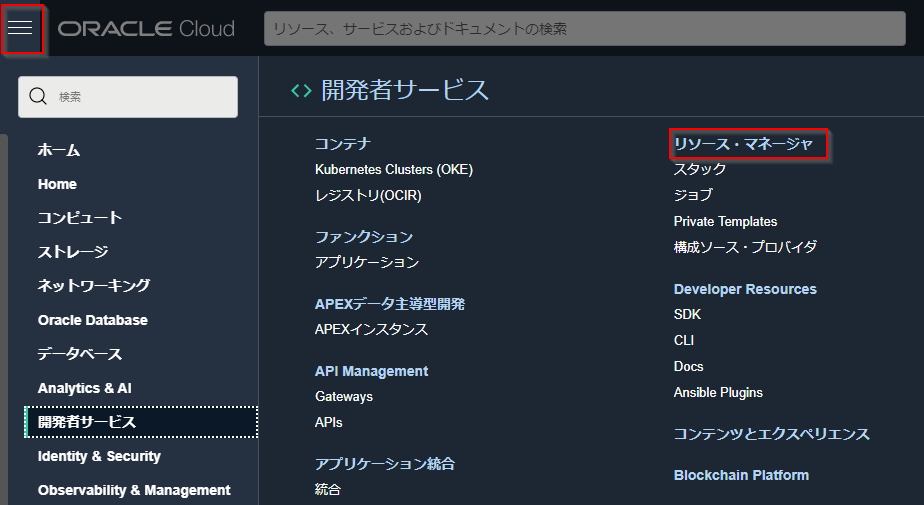 次に、画面左上のハンバーガーメニューを展開し、開発者サービス⇒リソース・マネージャを選択します。