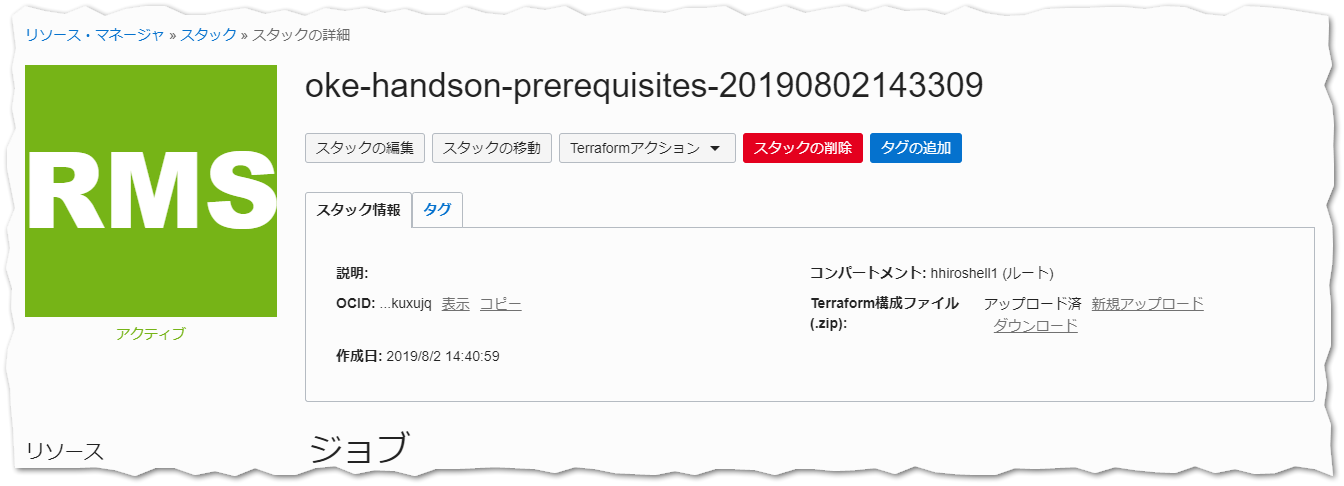 ここでは、ジョブを実行した結果作られたリソースに関連する情報を、確認することができます。ここまで正常に完了していれば、oke-clientとprivate_key_pemという情報が表示されているはずです。これらは、それぞれCLI実行環境のIPアドレスとSSH秘密鍵です。