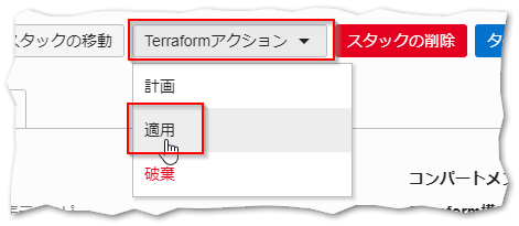 スタックの詳細画面でTerraformアクションメニューを展開し適用をクリックします。
