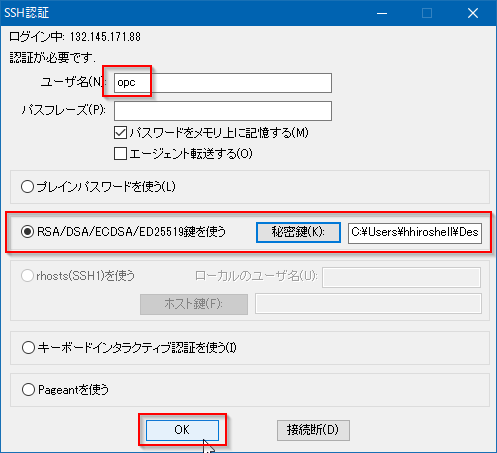 | ラジオボックスの選択 | RSA/DSA/EDCSA/ED25519を使うをオンにし、上の手順で保存した秘密鍵のファイルを(privatekey.pem)を選択する。 |