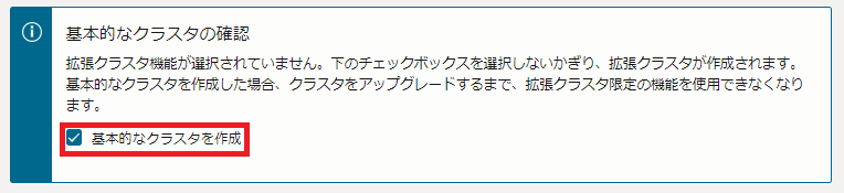次のダイアログは入力内容を確認し、「基本的なクラスタの確認」では、基本的なクラスタを作成にチェックを入れて、クラスタの作成をクリックします。
