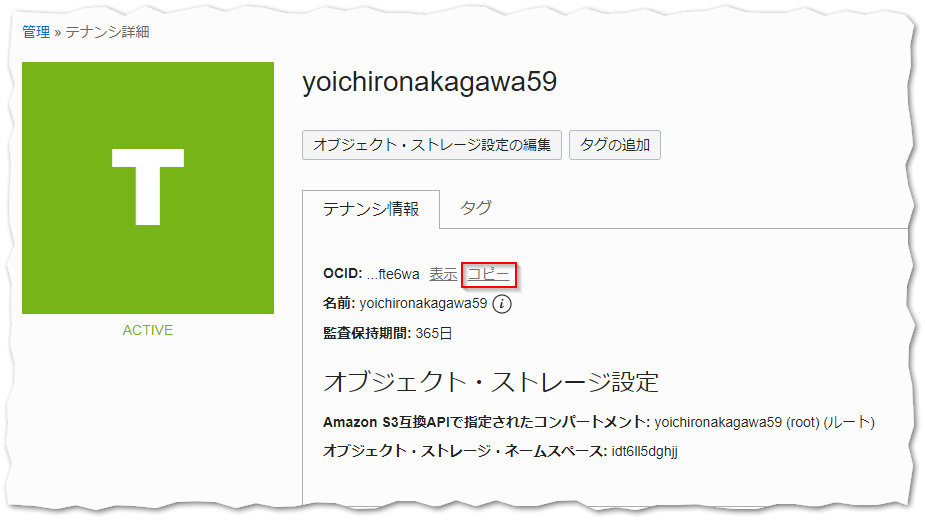テナンシ情報OCIDの右側にあるコピーをクリックすると、テナンシOCIDがクリップボードにコピーされます。