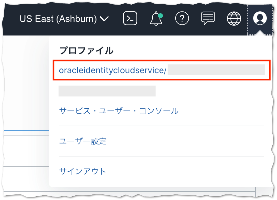 OCIコンソール画面右上の人型のアイコンをクリックし、展開したプロファイルからユーザ名(oracleidentitycloudservice/<ユーザ名>)をクリックします。
