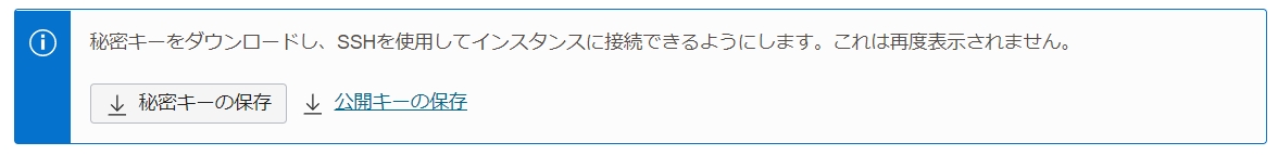 作成画面より、SSHキーの「秘密キー」と「公開キー」の両方をダウンロードし、利用します。