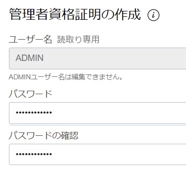 「データベース名」と「ホスト名」に任意の値を入力し、「データベース・ユーザー名」には「ADMIN」、「パスワード」と「パスワードの確認」には「Welcome1234!」と入力します。