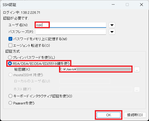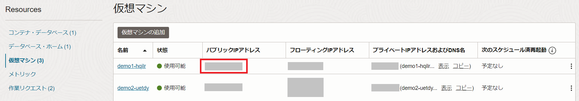 • SSH鍵 - 1. VMクラスタおよびデータベースの作成で追加した公開鍵と対になる秘密鍵を使用します。