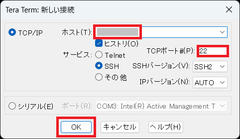 • パスフレーズ - 秘密鍵にパスフレーズが設定されている場合は指定してください。 下記は Tera Term を利用した場合の接続の設定例です。