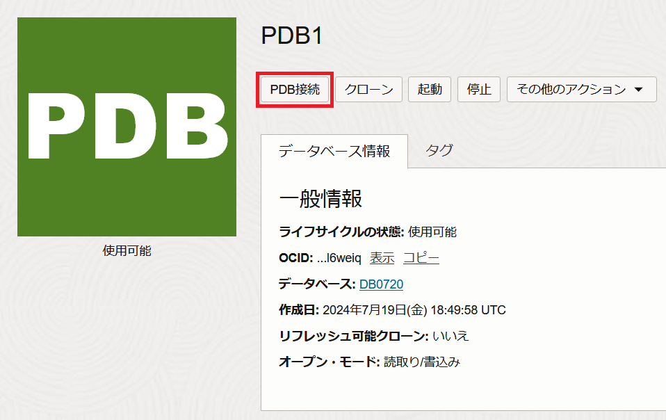 5. プラガブル・データベースの一覧から接続したいPDBの名前をクリックします。