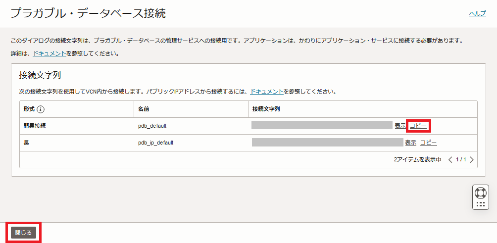 7. 簡易接続の接続文字列の右にあるコピーをクリックし、クリップボードに簡易接続文字列をコピーします。 その後、閉じるをクリックし、ダイアログを閉じます。