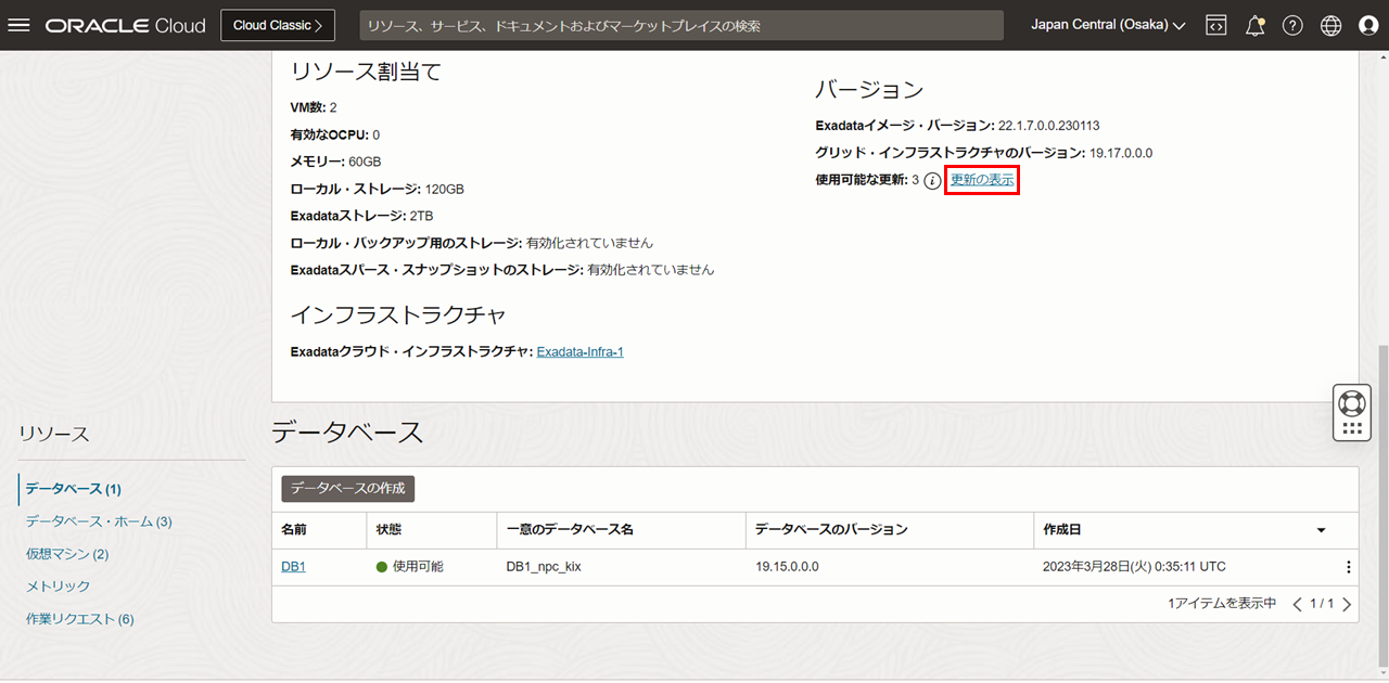 Exadata VMクラスタの詳細ページに戻ると、状態が更新中となっています。使用可能に切り替わるまで待機します。 パッチはDBサーバーへのローリングで適用されます。