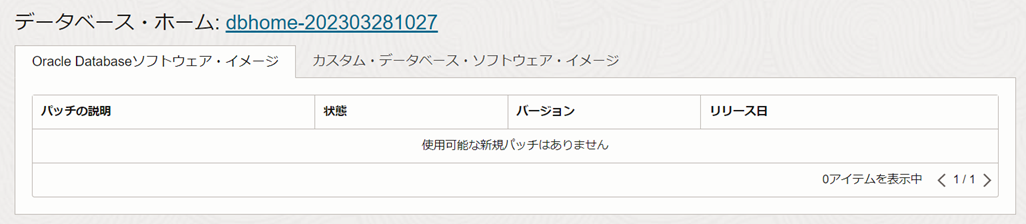 [root@orcl1 ~]# dbaascli patch tools list DBAAS CLI version 22.1.1.0.1 Executing command patch tools list Checking Current tools on all nodes orcl1: Patchid : 22.1.1.0.1_220223.0947 No applicable tools patches are available orcl2: Patchid : 22.1.1.0.1_220223.0947 No applicable tools patches are available All Nodes have the same tools version適用可能なパッチが存在する場合、以下のようになります。