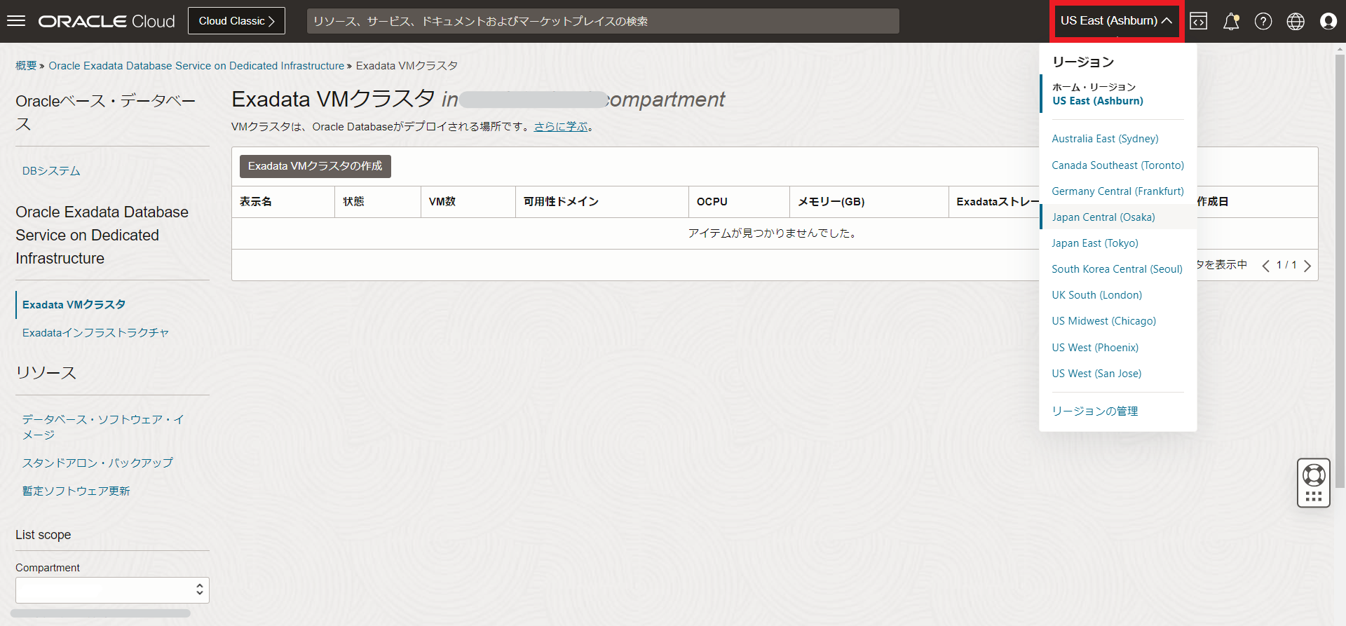 OCIコンソール・メニューから Oracle Database → Oracle Public Cloud上のExadata に移動します。