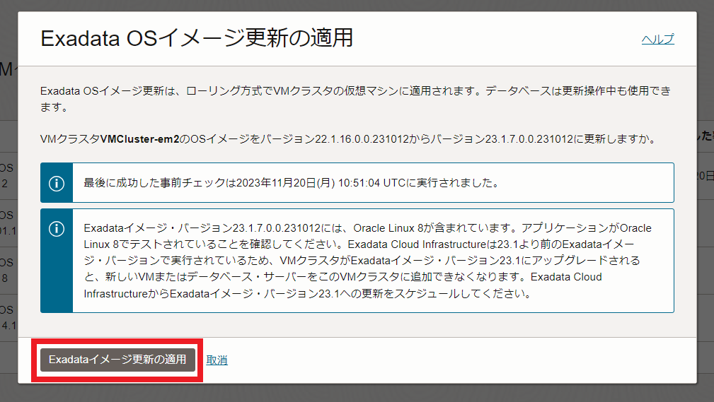 事前チェックで問題がなければ、アクション・ボタンをクリックして、Exadata OSイメージ更新の適用をクリックします。