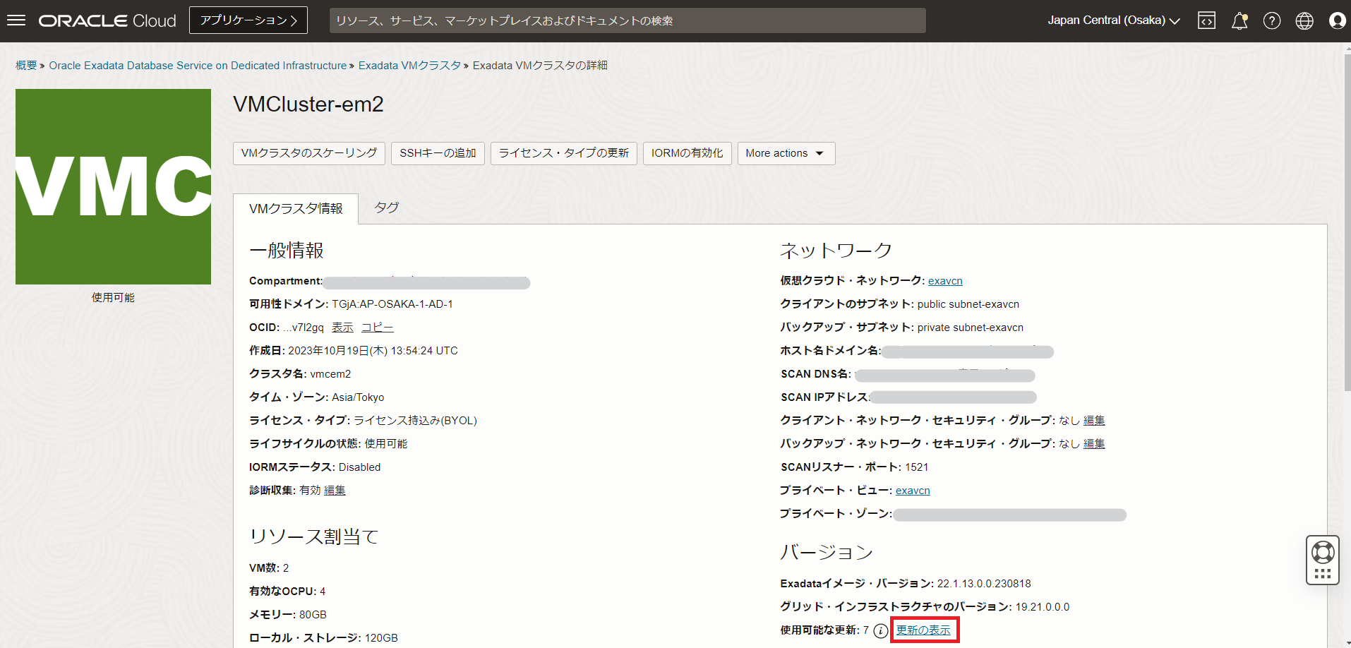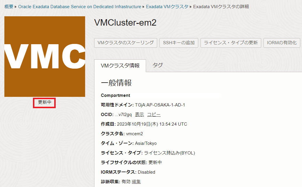 Exadata VMクラスタの詳細ページに戻ると、状態が更新中となっています。使用可能に切り替わるまで待機します。パッチはDBサーバーへのローリングで適用されます。