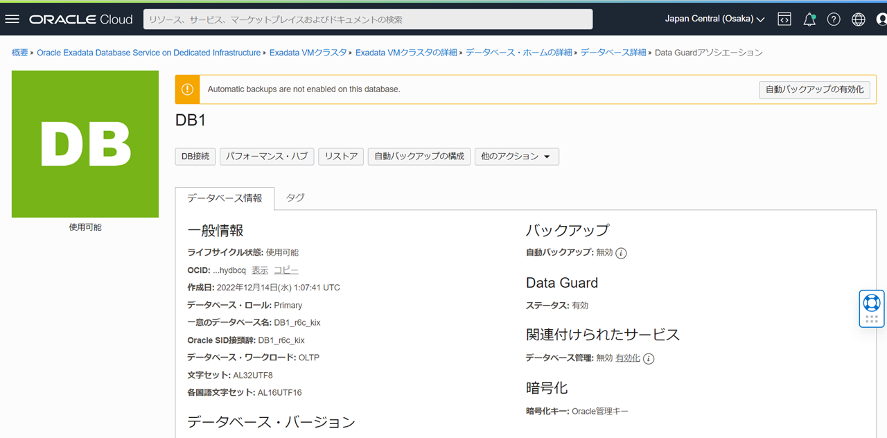 スタンバイ・データベースのリージョン(本ガイドでは大阪リージョン)のデータベース詳細のリソースの一覧からData Guardアソシエーションをクリックし、プライマリ・データベースの情報が追加されていることを確認します。