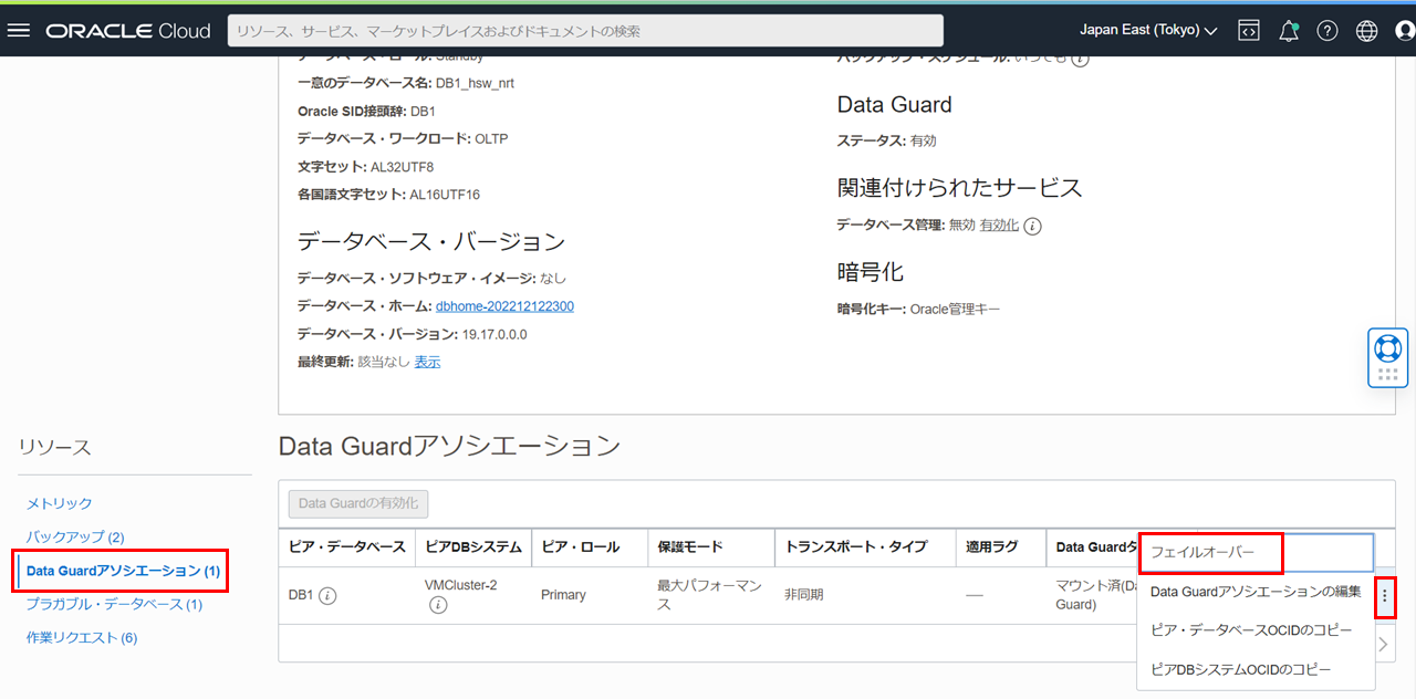 スタンバイ・データベースのリージョン(本ガイドでは東京リージョン)のデータベース詳細のリソースの一覧からData Guardアソシエーションをクリックし、アクション・ボタンをクリックし、フェイルオーバーをクリックします。