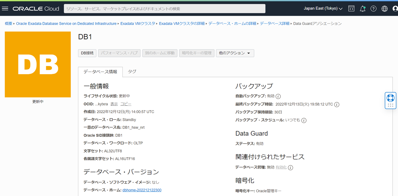 プライマリ・データベースのリージョン(本ガイドでは東京リージョン)のデータベース詳細のリソースの一覧からData Guardアソシエーションをクリックし、スタンバイ・データベースの情報が追加されていることを確認します。