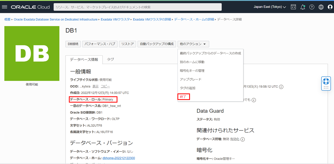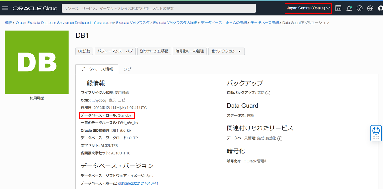 データベースの状態が使用可能になるとプライマリ・データベース(本ガイドでは、東京リージョン)とスタンバイ・データベース(本ガイドでは、大阪リージョン)のそれぞれのデータベース・ロールが切り替わります。
