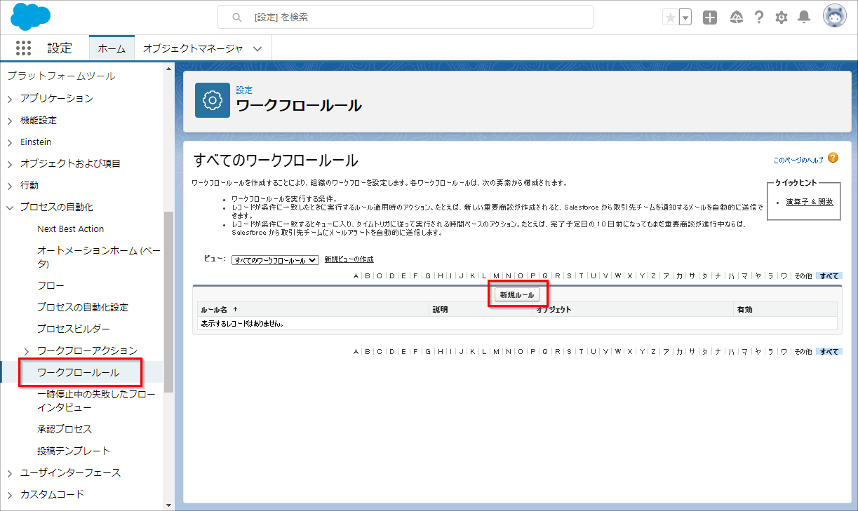 2. 「プロセスの自動化」→「ワークフロールール」 をクリックします。