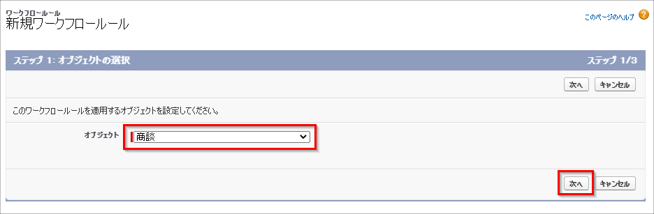 4. オブジェクトで 「商談」 を選択し、「次へ」 をクリックします。