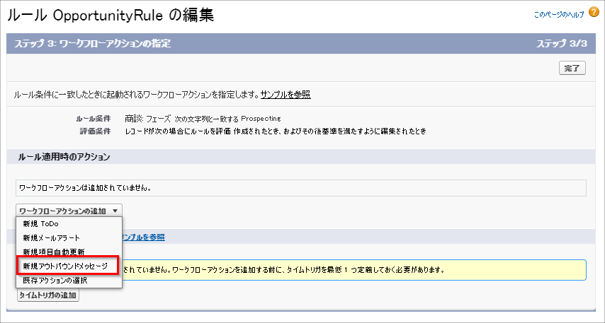 「ワークフローアクションの追加」 で 「新規アウトバウンドメッセージ」 を選択します。