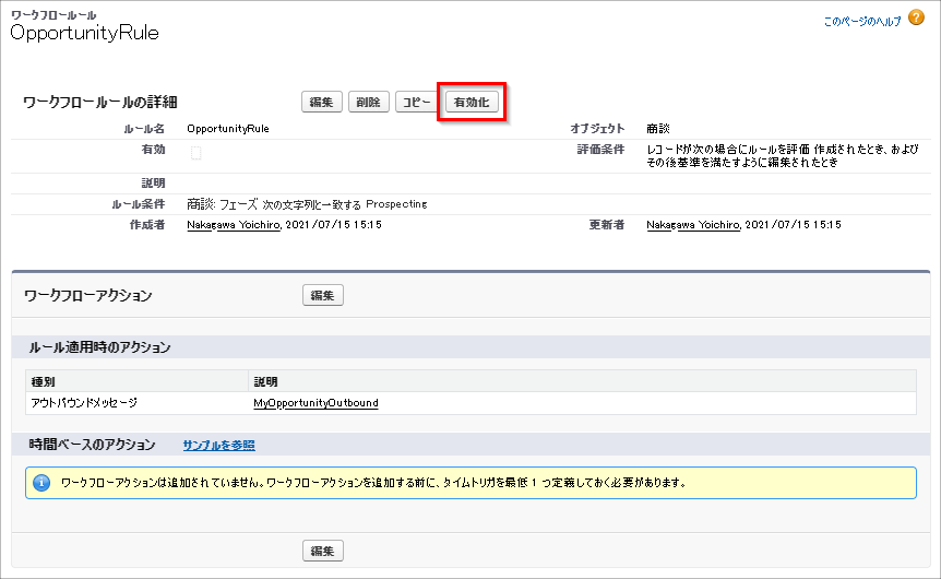 「有効化」 をクリックし、ワークフロールールを有効化します。