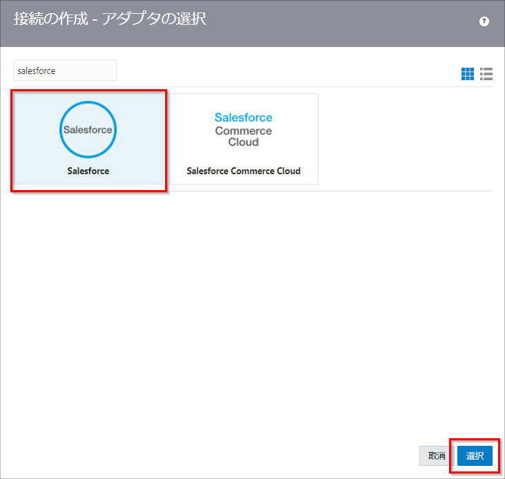 検索ボックスに salesforce と入力すると、Salesforce アダプタを素早く探すことができます。 {: .notice–info}