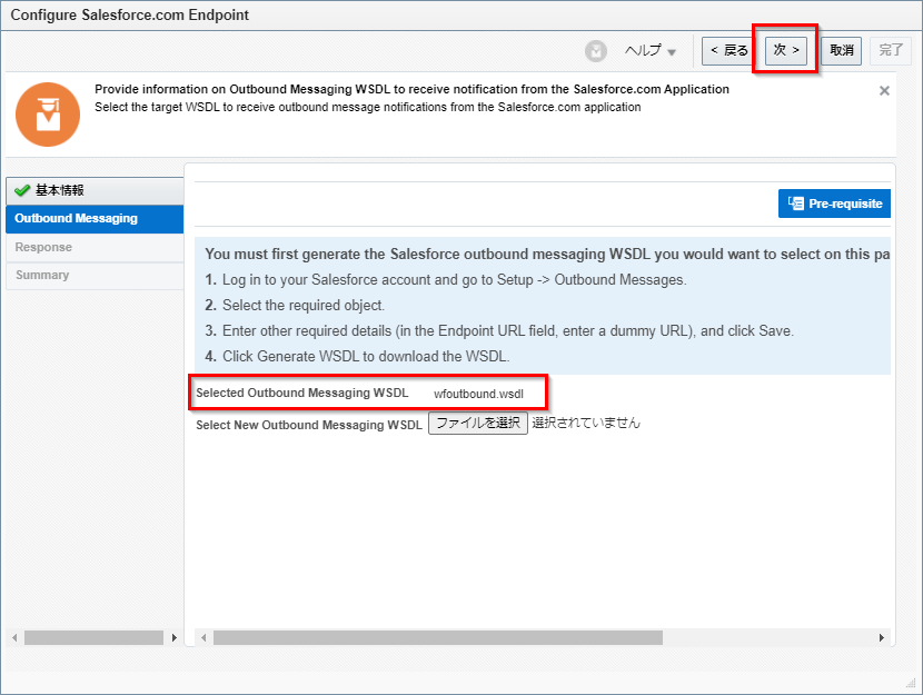 「Select Outbound Messaging WSDL」で、事前準備でSDFCよりダウンロードした アウトバウンドメッセージの WSDL ファイル(wfoutbound.wsdl) を選択し、「次 >」 をクリックします。