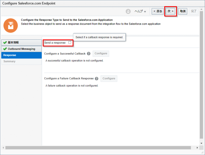 「Send a response」 のチェックを外し、「次 >」 をクリックします。