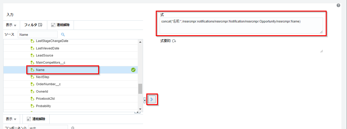 ソースの notifications → Notification → Opportunity → Name を選択し、「 > 」 をクリックします。