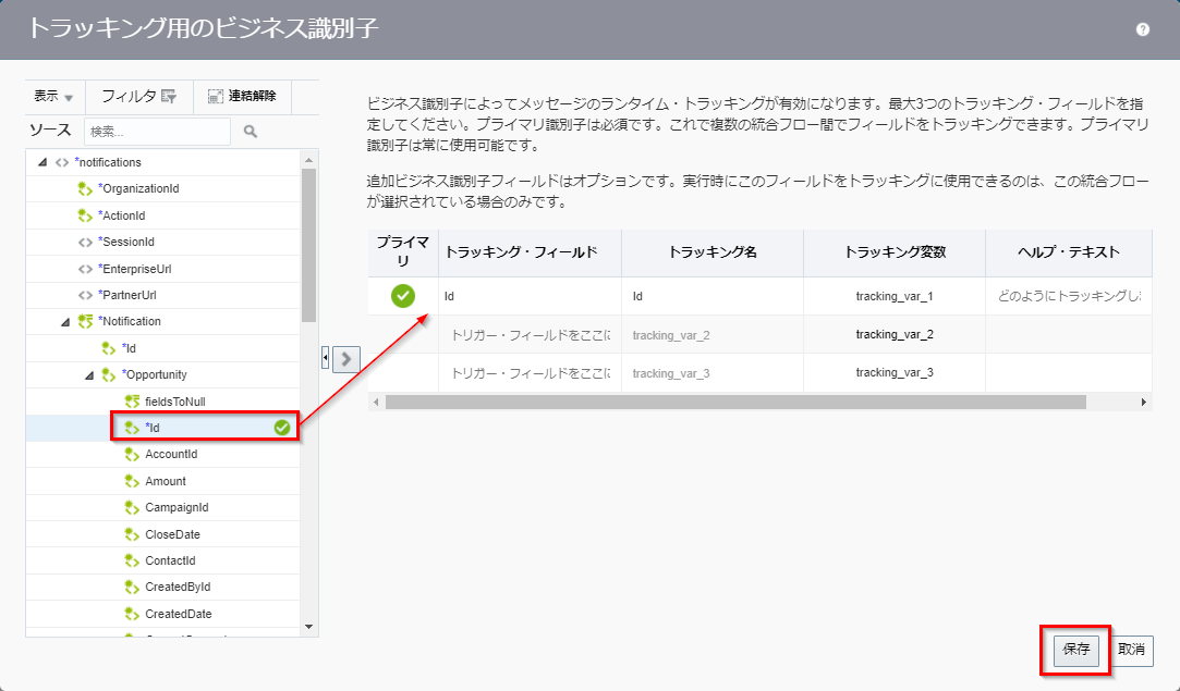 ソースの notifications → Notification → Opportunity → id を、トラッキング・フィールドにドラッグし、「保存」をクリックします。